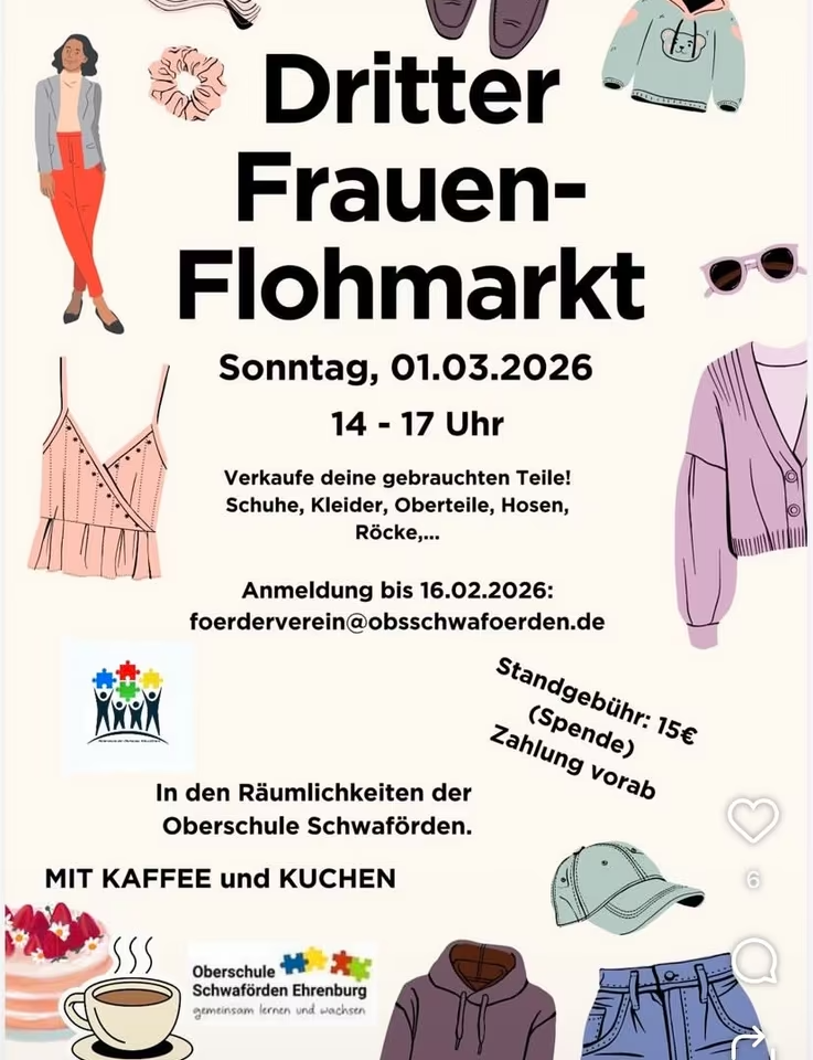 Start Events - Gemeinde Ehrenburg Frauenflohmarkt Frauenflohmarkt Datum 01.03.2026 bereits stattgefunden Uhrzeit 14:00 - 17:00 Ort OBS Schwaförden Ehrenburg Veranstalter Förderverein der OBS Teile diese Veranstaltung